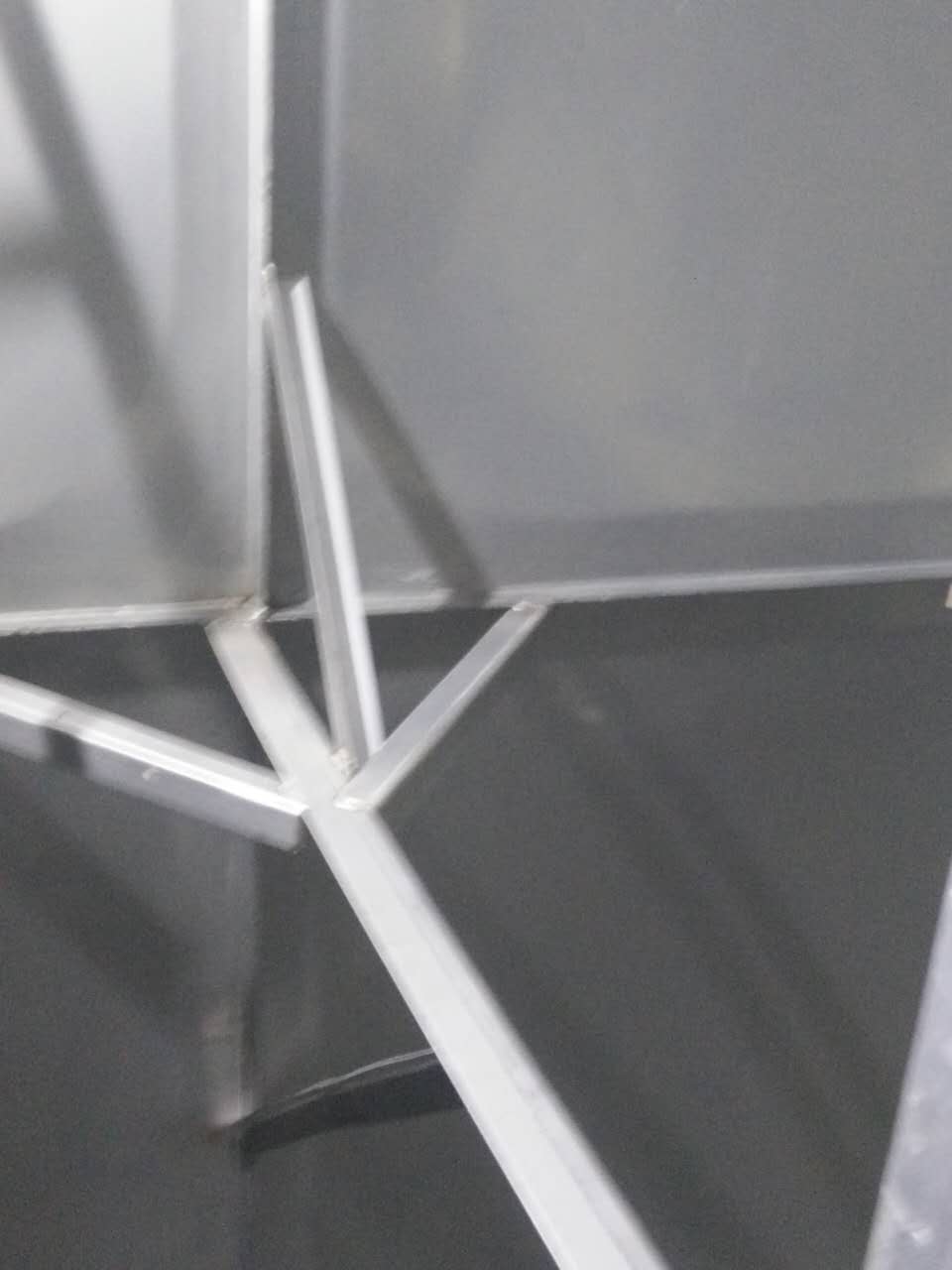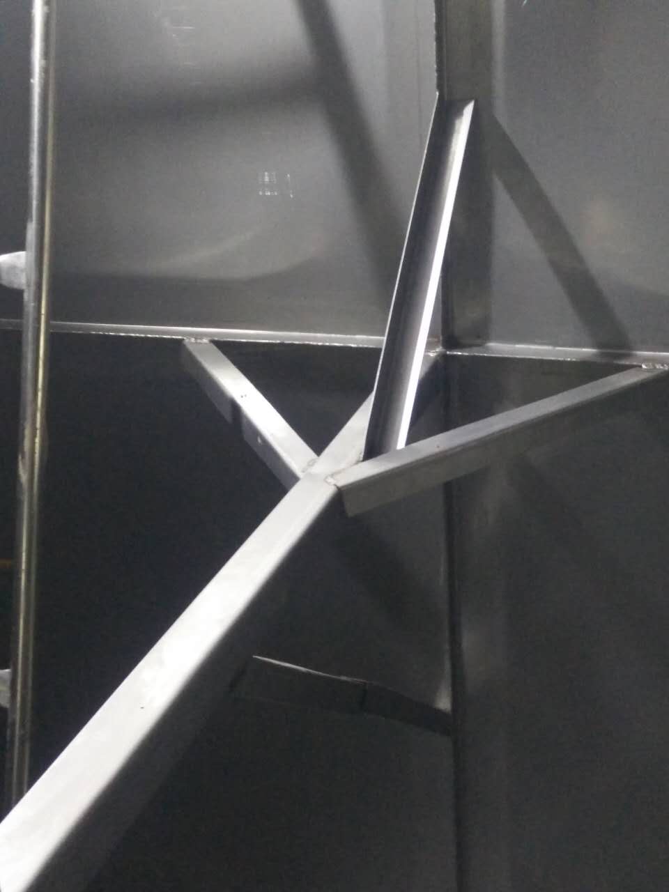 斜拉主要的作用在于分擔主拉筋的拉力,進一步對水箱板進行穩固,切成500mm的長度,連接在水箱與主拉之間。形成龍爪式,常規尺寸為4cm*1cm厚度一般以靠近頂部的側板厚度為基準,連接處必須進行滿焊處理。