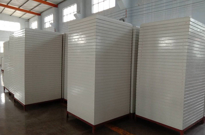 將備好的原材料根據(jù)規(guī)則的份額進(jìn)行配料,然后拌和料漿成樹脂糊;將制成的樹脂糊與玻璃纖維紗通過SMC片材機組浸漬制成SMC片材;通過48h加溫固化后,查驗片材,依照所需標(biāo)準(zhǔn)進(jìn)行裁剪、稱重、疊放、均勻鋪置于已經(jīng)整理并升溫至120-140℃的模具中進(jìn)行模壓并依照要求保壓后開模;脫模構(gòu)成成型的SMC單板,對SMC單板的飛邊打磨修整后進(jìn)行查驗;查驗合格的SMC單板按方位打好安裝孔,進(jìn)行包裝、入庫;將SMC模壓單板、已按方位打好安裝孔的橡膠密封條、不銹鋼支架(拉筋)組合拼裝成SMC組合式水箱,查驗;查驗合格為制品。